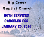 Big Creek Baptist Church, both services for tomorrow are canceled due to inclement weather for January 25, 2026. Stay warm and spend some time in God's word.